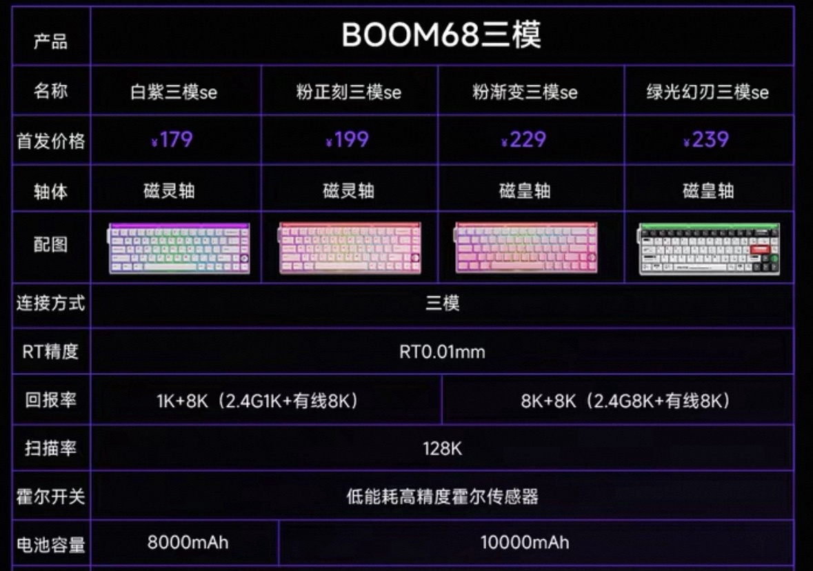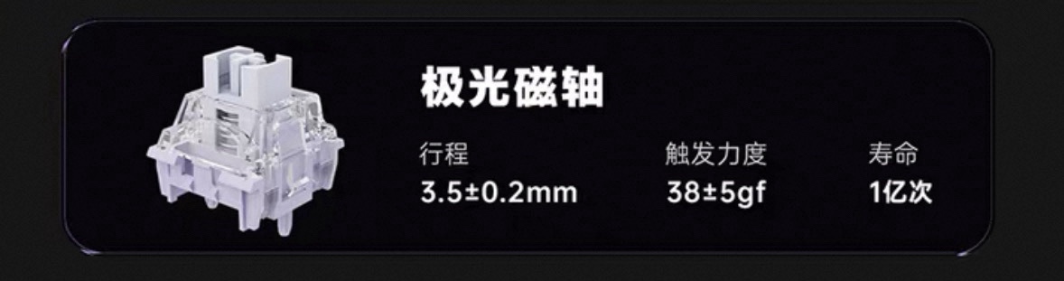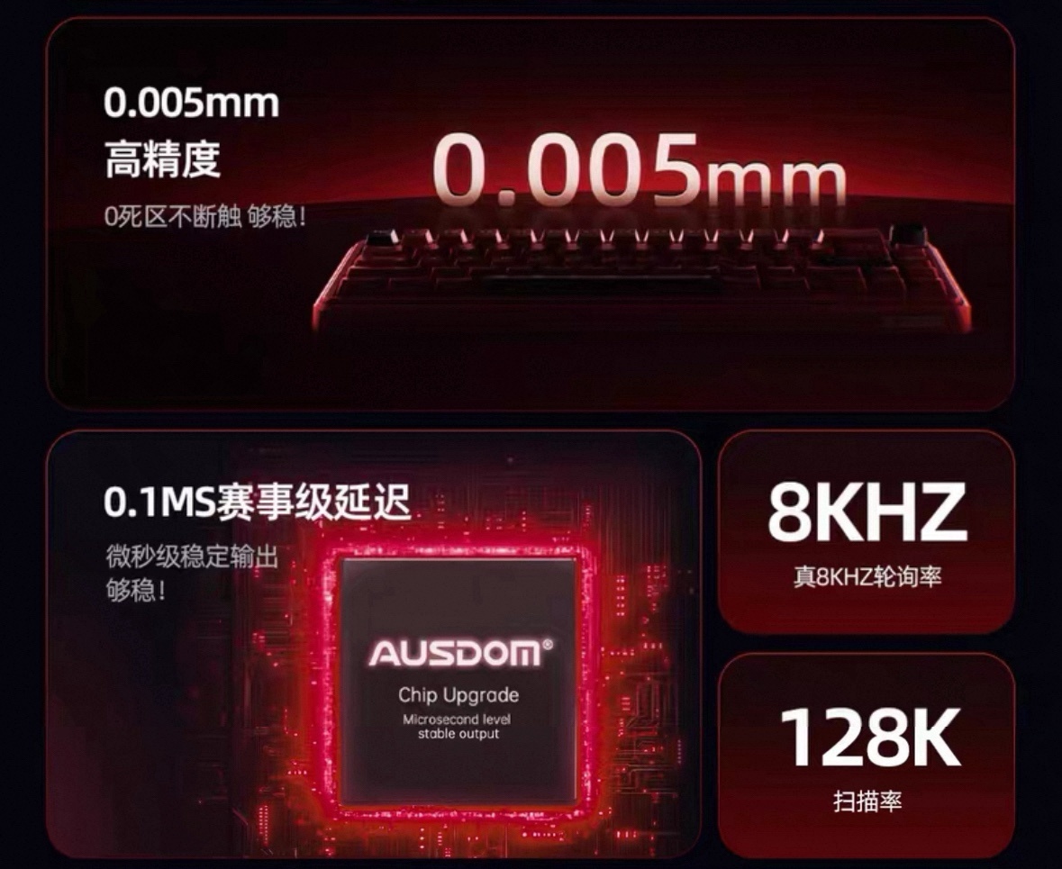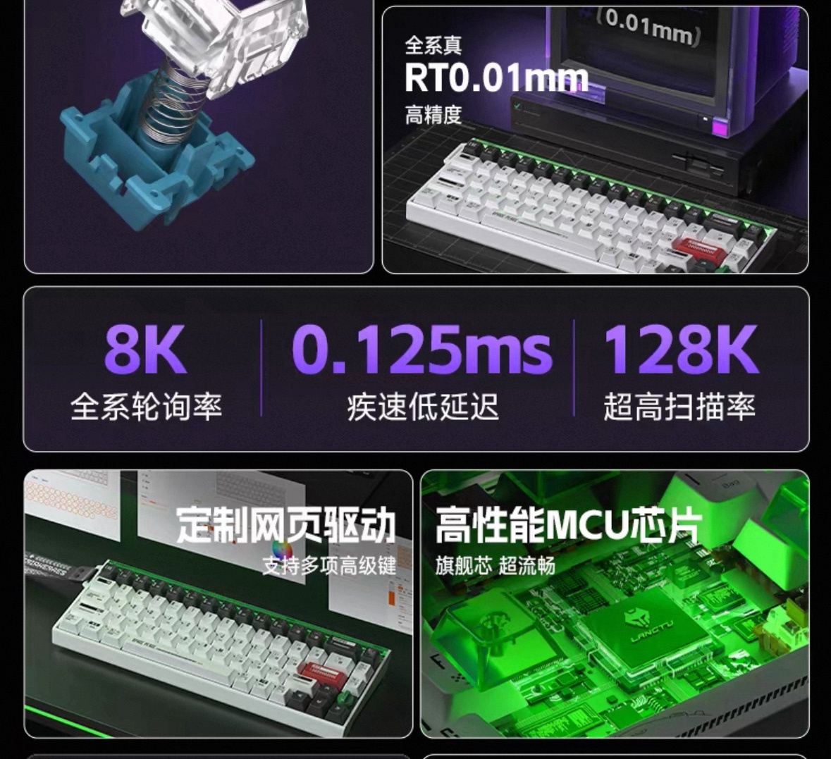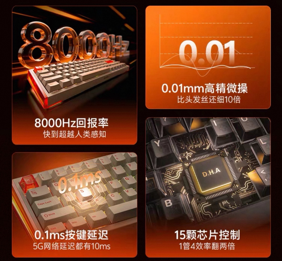 性能:8000Hz回报率+0.005mmRT精度+0.1ms按键延迟+32K全键扫描256K扫描率