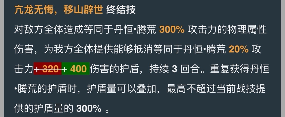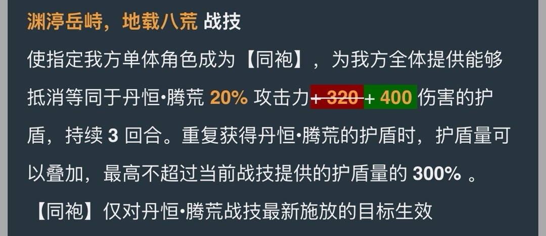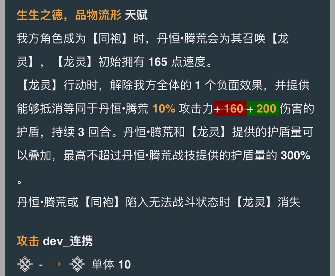 改:【龙灵】行动时,额外为当前护盾值最低的我方目标提供能够抵消等同于丹恒•腾荒 5% 攻击力+ 100 伤害的护盾。重复获得丹恒•腾荒的护盾时,护盾量可以叠加,最高不超过当前战技提供的护盾量的 300% 。强化【龙灵】行动时,额外对当前生命值最高的敌方单体造成1次等同于【同袍】 40% 攻击力的相应属性附加伤害。