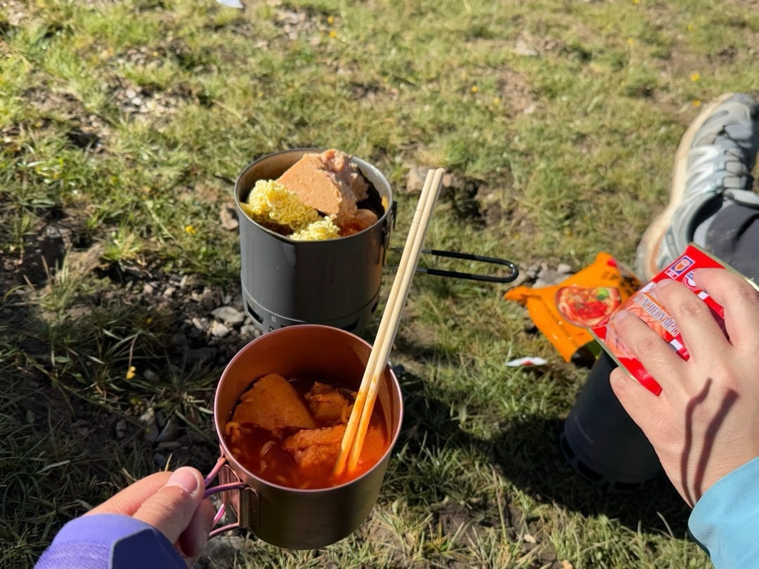 第二天早上,睡醒早饭煮了泡面和午餐肉哈哈哈哈,番茄味好吃!水前一天晚上过滤了