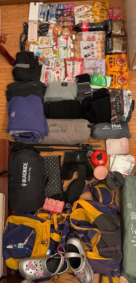 硬壳冲锋衣冲锋裤、抓绒衣裤、速干衣裤、徒步袜、高帮徒步鞋、冷帽、面罩、55+10L徒步包、帐篷、睡袋B700、蛋巢、头灯、手电、登山杖、护膝、滤水器、炊具、食物