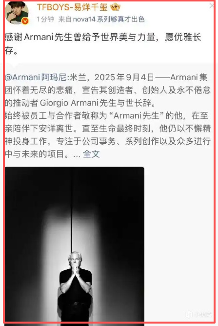 易烊千玺则提到,感谢阿玛尼先生曾为世界带来美与力量,愿这份优雅能长久留存。