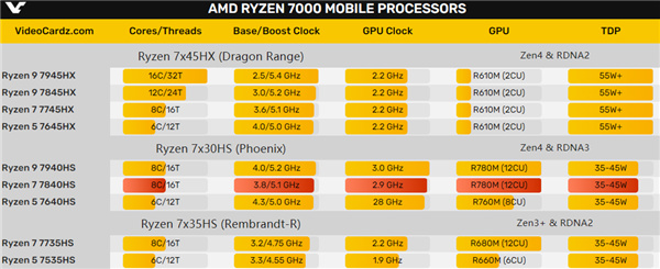 4nm工藝、Zen4 CPU架構、RDNA3 GPU架構、8MB+16MB二三級緩存、8核心16線程、5.1GHz加速頻率、Radeon 780M 12單元核顯、35-54W功耗。