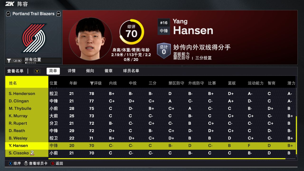 NBA 2K26 初始能力值 70,部分细分:站扣75、中投66、三分66 。