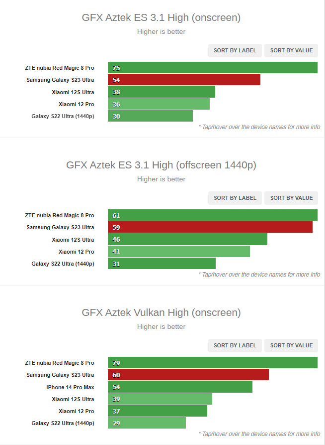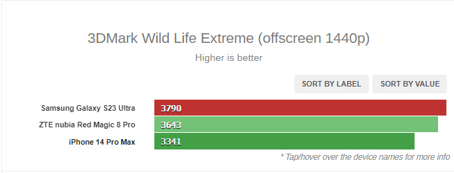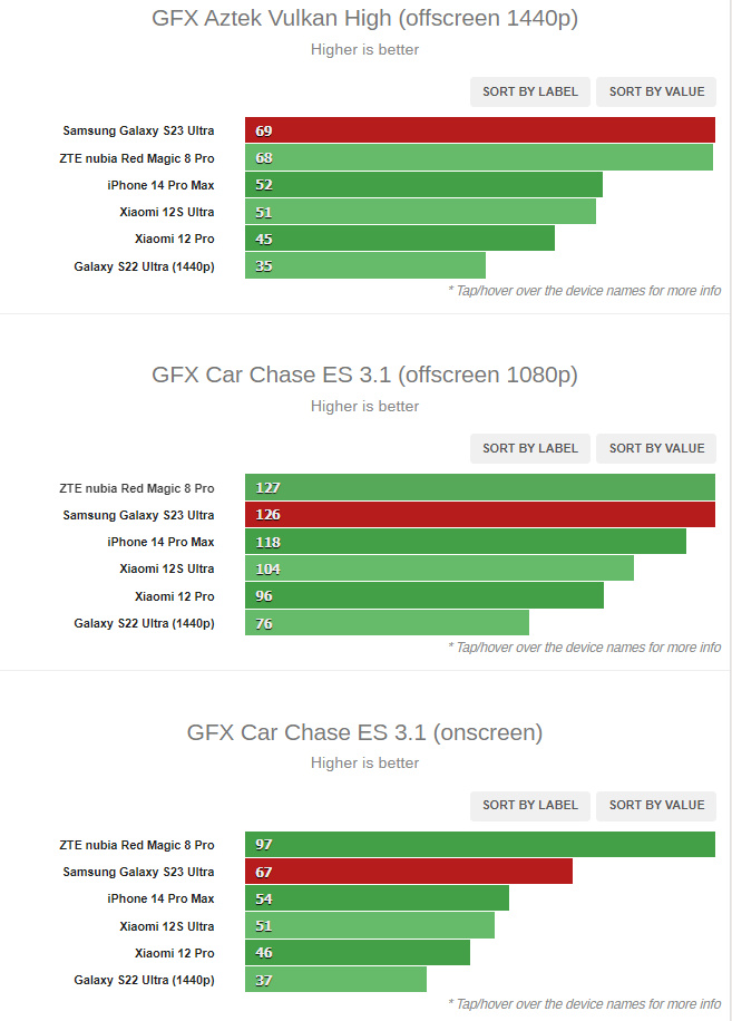当涉及到 GPU 密集型任务时,骁龙 8 Gen 2 for Galaxy 优势明显。在几乎所有的 Offscreen 测试中,Galaxy S23 Ultra 都领先于其他手机,只有在 Onscreen 测试时受到较低分辨率手机的挑战时才落于下风。