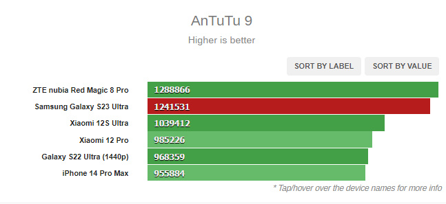 在安兔兔测试中,Galaxy S23 Ultra 落后于红魔 8 Pro,但后者是一款游戏手机,屏幕分辨率仅为 1080p+,图形算力的要求较小,毕竟安兔兔是一个综合测试。成绩还显示,骁龙 8 Gen 2 for Galaxy 比骁龙 8+ Gen 1 芯片快得多,甚至比iPhone 14 ProMax 内的 A16 Bionic 也快。