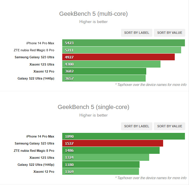 总体来看,Galaxy S23 Ultra 在 CPU 测试中比 Galaxy S22 Ultra 快 30-35%,在安兔兔 9 综合基准测试中快 30% 左右。在 GFX Bench 和 3DMark GPU 测试中,Galaxy S23 Ultra 最高提供高达 2 倍的性能提升,在大多数情况下也有 80-90% 的提升。
