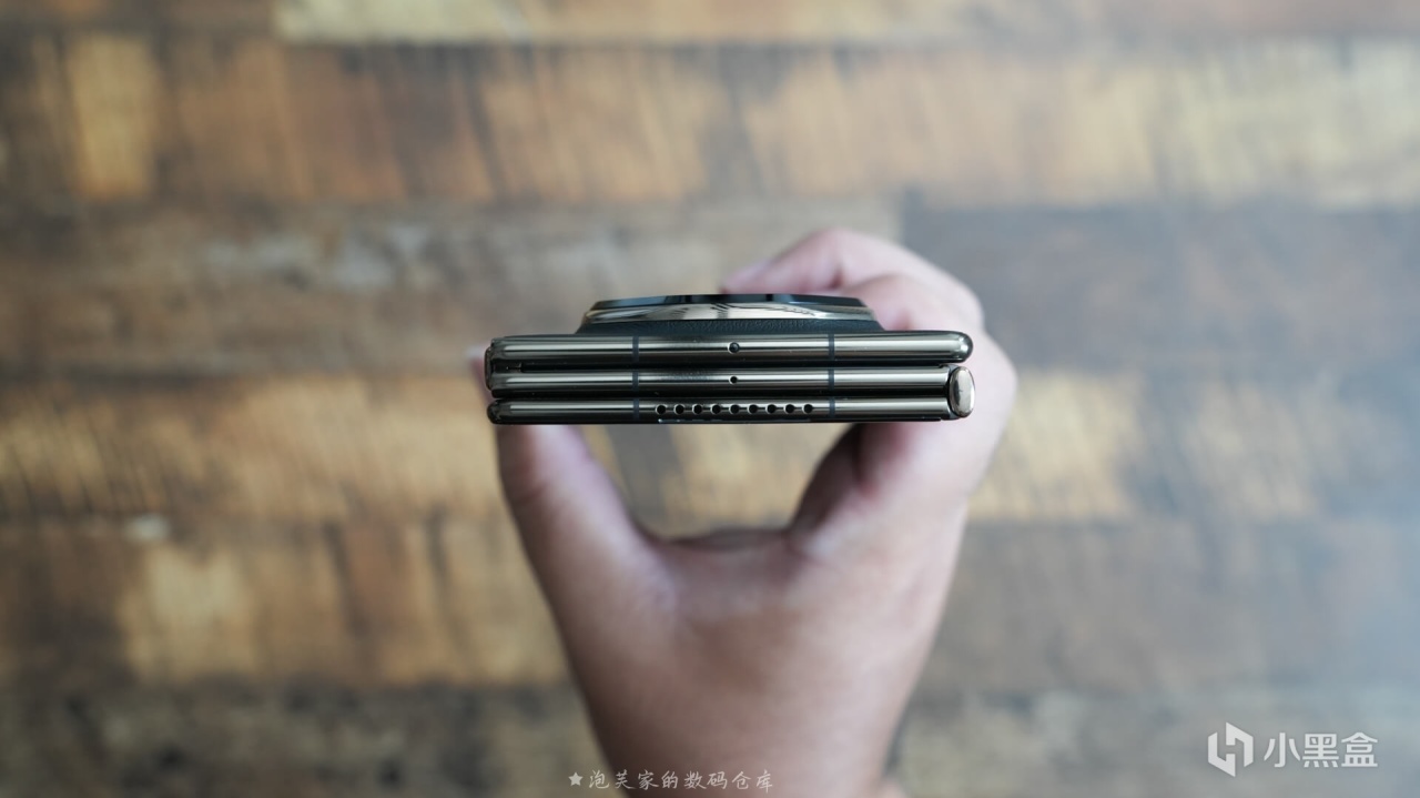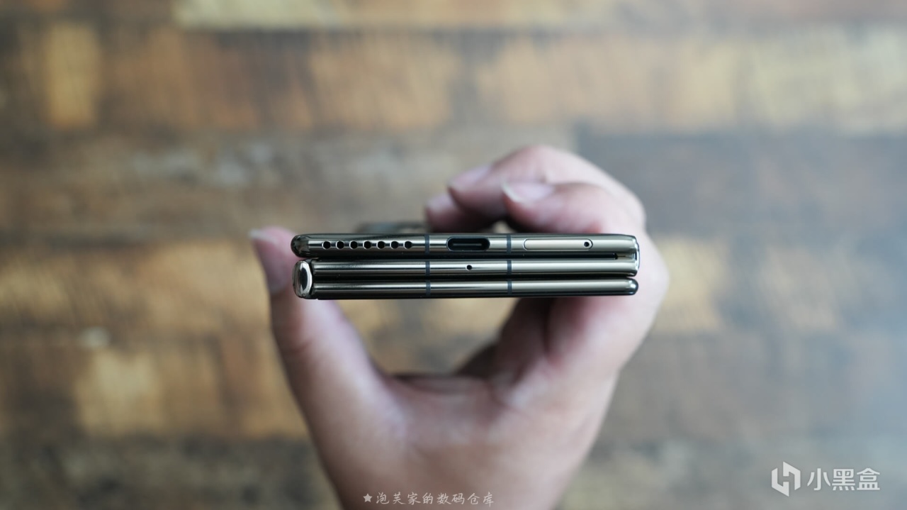 底部依次是扬声器格栅、SIM卡槽、USB-C接口和麦克风。和其他品牌折叠屏不同的是,它因为三折结构,机身厚度无法做到均匀。