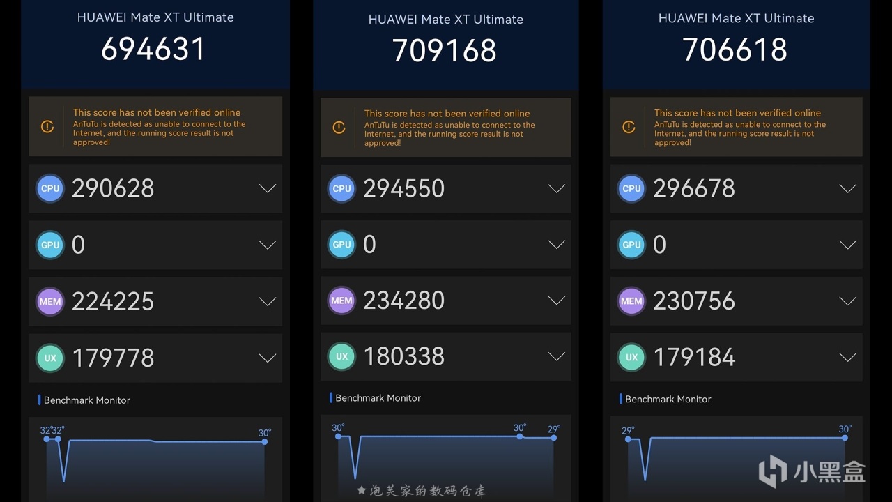 为了测试发热和性能持续性,我连续跑了3次跑分:虽然GPU没能测出分数,导致总分偏低,但能看到每次跑分成绩都在上升(分别为694631分、706618分、709168分)。每次跑分手后测外部温度,MateXT分别是34.3℃、34.6℃、35.6℃,而ZFold6则是39.3℃、40.2℃、39.8℃,差距特别明显。