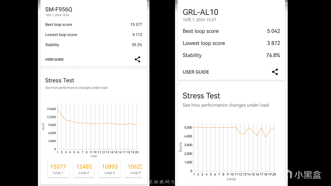 之后又用3DMark WildLife StressTest测试性能稳定性:ZFold6的最佳循环分数15377分、最低9112分、稳定性59.3%;MateXT最佳循环分数5042分、最低3872分、稳定性76.8%,虽然MateXT的最佳分数只有ZFold6的三分之一,但稳定性更高。测试结束后,两款机型的外部温度都在40.4℃左右,看来长时间高负载下,发热情况相差不大。不过MateXT测试结束后,因为发热限制了部分软件使用功能,好在机身冷却很快,我个人倒是不介意,但如果想长时间玩游戏,那就GG了。