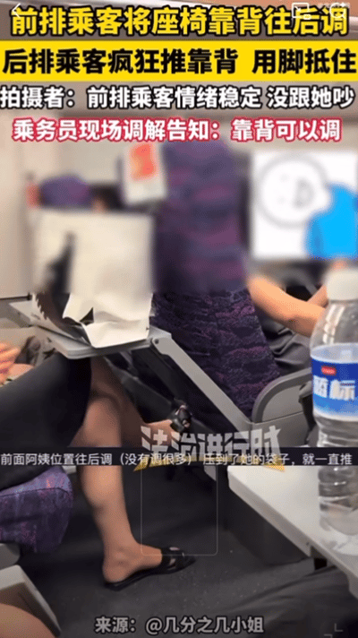 8月30日,上海(发布),高铁上一阿姨按正常幅度调节座椅靠背时,不慎轻微触碰后排女子放置在小桌板上的袋子。后排女子随即情绪失控,持续用手猛推前排座椅靠背,并伸脚抵踹,拍摄者表示前排乘客情绪稳定,没跟后排吵。乘务员调解了两次,告知其:靠背可调节。