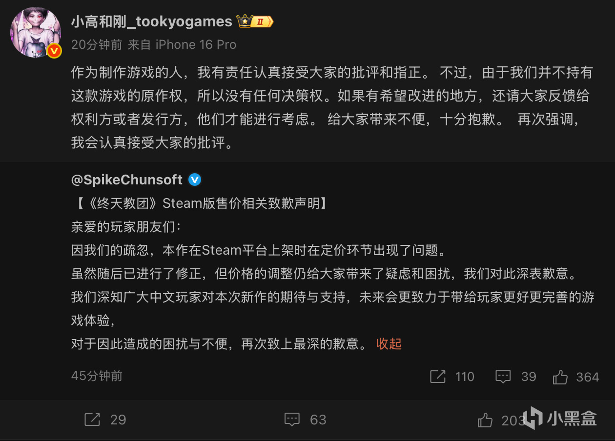 小高转发发行商微博并解释:“由于我们并不持有这款游戏的原作权,所以没有任何决策权。“