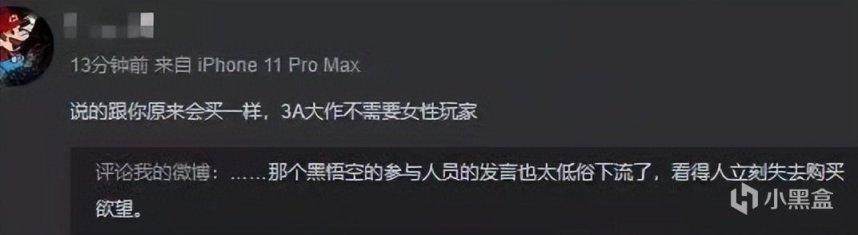 如你所见,这话本来是针对某个姐妹购买态度的回应,但多亏了某些人的添油加醋,此番言论在传播过程中毫不意外地被扭曲成了“游戏主创怒喷女玩家,称3A游戏不需要女性玩家”,于是游戏科学几乎是不可辩驳地成为了厌女的游戏团队,而演示中缺乏女性角色竟也成了主创厌女的石锤,一时间姐妹们群情激愤,誓与这“死直男”团队不共戴天,这才出现了前文提及的一幕幕,其实是吃力不讨好的反向宣传……嗯,这应该就是传说中的“粉丝行为,偶像买单”吧。