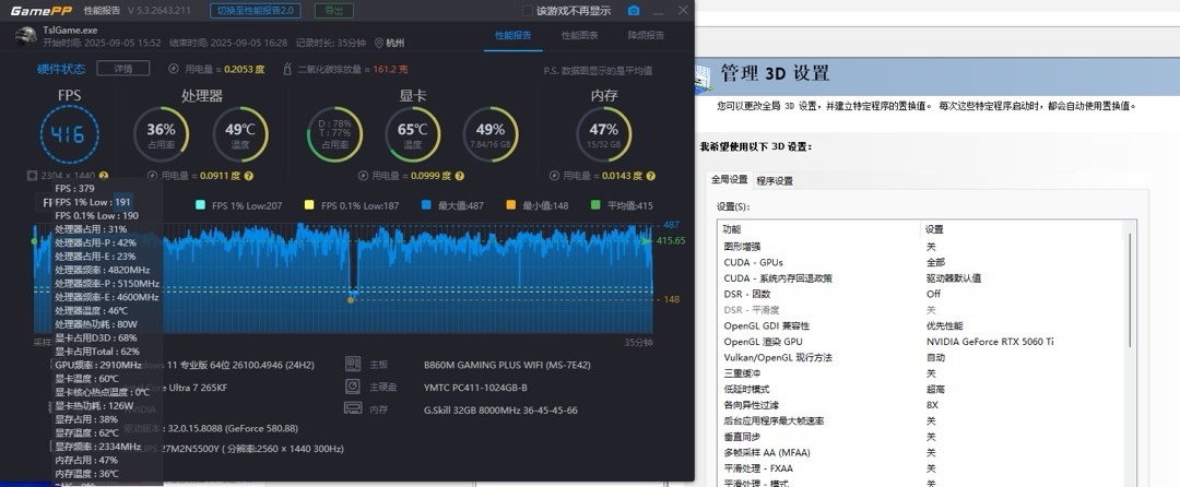 我發出這265kf.5060ti16絕地求生2k跑410幀,可能很多人不相信,6.18買的整機,湊上國補和Vip88券,當時拿到了265KF加5060TI的主機,花了6950,但是後來加359換卡主板,因爲國補機器比較坑,主板8項供電,後來換了微星的B860gaming plus WiFi,然後就進遊戲,我只玩喫雞,發現滿足不了我,幀數不高,因爲強迫症,屏幕是300hz的,來了插針才240左右,後來就只在網上優化硬件系統和遊戲設置,自己超了下內存,也大概上了300左右,然後有次更新顯卡驅動還是N卡設置,結果直接遊戲廢了,卡頓,後來發現low幀這個指標非常不穩定!300刷的屏幕加高幀率他時不時給你卡一下,讓強迫症的我非常不爽,但是幀率一直很高,打架決賽跑圖不會低於240左右。但就是時不時low幀掉到50,60的那一下讓你非常難受,後來又換了6400,C32的內存超頻,還是不行。中間更換了多次驅動和系統,還不行,我直接在換7400C32,繼續超頻8000C36,自己改小參,又黑屏,然後這電壓的,中間太曲折,超頻過全是比之前穩定了些,但是並沒有滿足我的使用,因爲畫質和絲滑度,最後給我整的有些疲憊,心想算了就這玩吧,網上都說265k玩網遊沒有沒147好,內存延遲也高,我心想硬件既然是這就不折騰了,前天刷抖音看到濾鏡和N卡,自己又要折騰了,又設置下這,設置下那,設置下顯示器,然後昨天居然給設置到我非常滿意的效果了!是非常滿意,比之前高清不說,而且這種絲滑程度真的是太帥,太爽了,基本low幀在200左右,且幀數上了400➕!!!幀數我覺得跑滿顯示器就不用糾結在高的幀數了,重點是low幀穩纔是真的穩!爲了玩這個遊戲,歷經快一個月的調試!我非常滿意!爲什麼說我發出來大家不相信,因爲我到現在沒有看到過,5060ti開插針跑出穩定400幀左右,low幀200左右的數據!有,那也是我孤陋寡聞了,在此祝爲了調試機器糾結的玩家早日脫離苦海,專心體驗遊戲的樂趣!