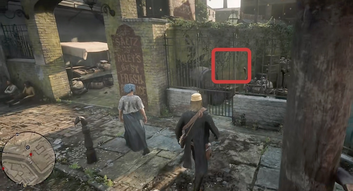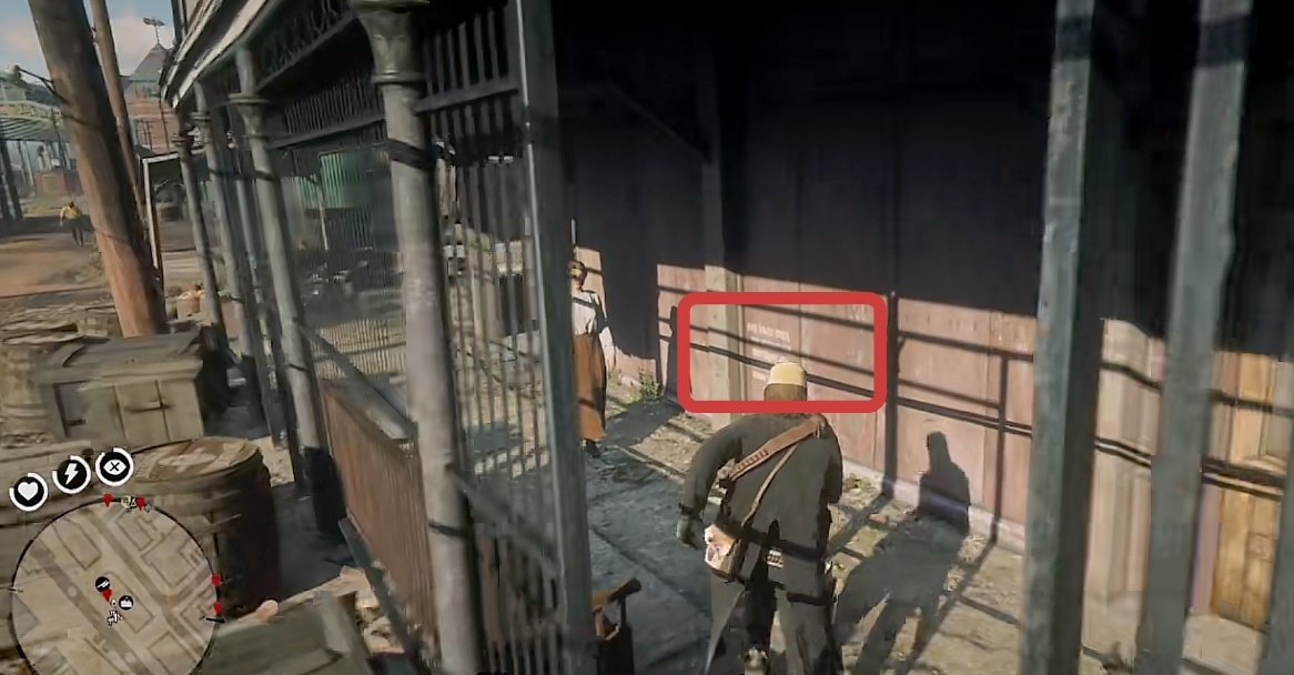 位置特征:肉铺与杂货店中间、靠近铁轨的墙上