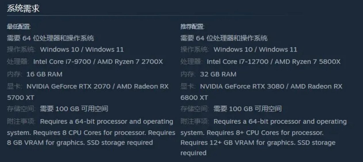 该作在Steam国区售价分别为标准版298元、豪华版428元、超级豪华版558元。PC端最低显卡要求为RTX 2070,推荐显卡为RTX 3080,并需预留100GB存储空间。