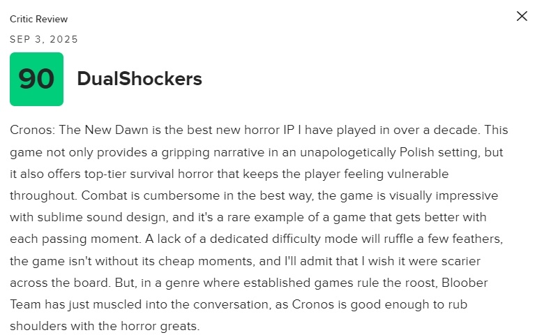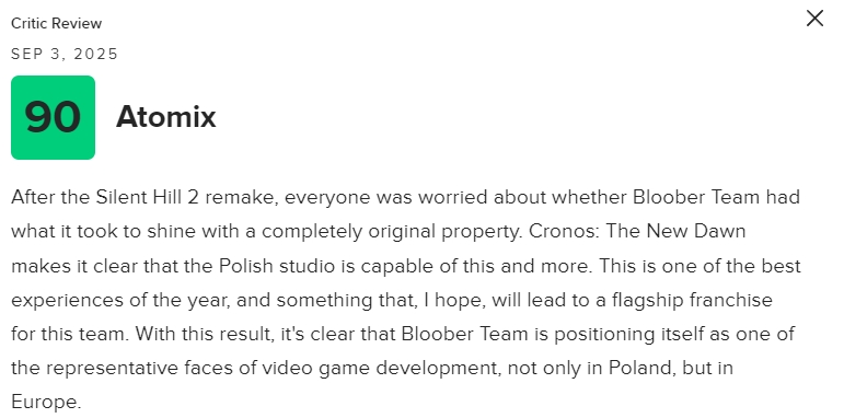 在《寂静岭2:重制版》之后,大家都担心Bloober Team是否有能力用一部完全原创的作品来继续在业界发光发热。但《时间旅者:重生曙光》清楚地表明这家波兰工作室有能力做到这一点甚至于更多。于我而言本作是我今年最好的游玩佳作之一,我希望这会帮助这支出色的团队拥有一个独创的游戏系列。我相信作为一家主机游戏开发商,Bloober Team会闪耀全欧。