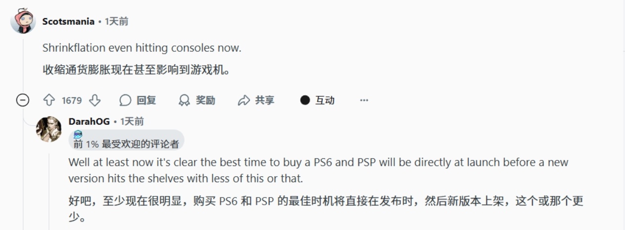 玩家们在Reddit上纷纷表达不满。有用户调侃道“没想到游戏机越新配置反而缩水”,更有人讽刺索尼未来可能会继续减少手柄按键和摇杆却保持同价。许多玩家将此举称为 “缩水通胀” 的典型例子,认为这是变相涨价行为。