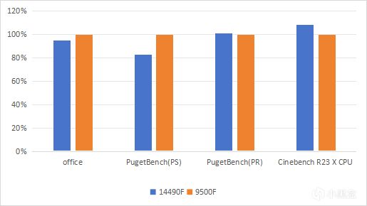 当然,买一款处理器,除了要用来打游戏之外,还得考虑办公场景。在运行office和PS基准测试时,可以看到9500F相比于14490F似乎有不少优势;而在运行PR和渲染测试时,又可以看出14490F的优势来了,相比于9500F的100%基准,14490F可以达到101%、108%。既然要兼顾办公、游戏,一款稳定的U谁能不爱呢?