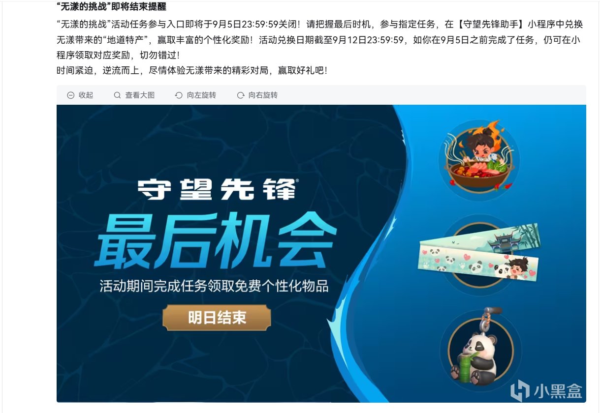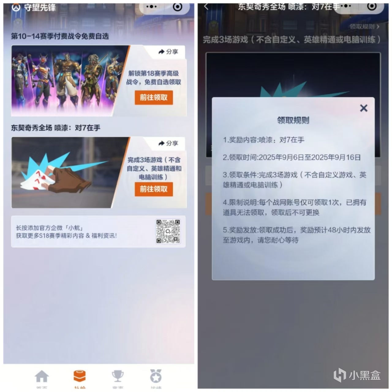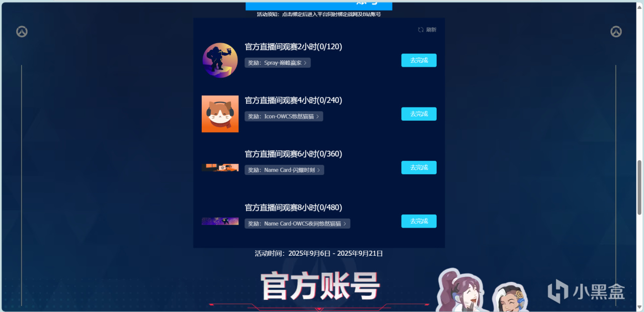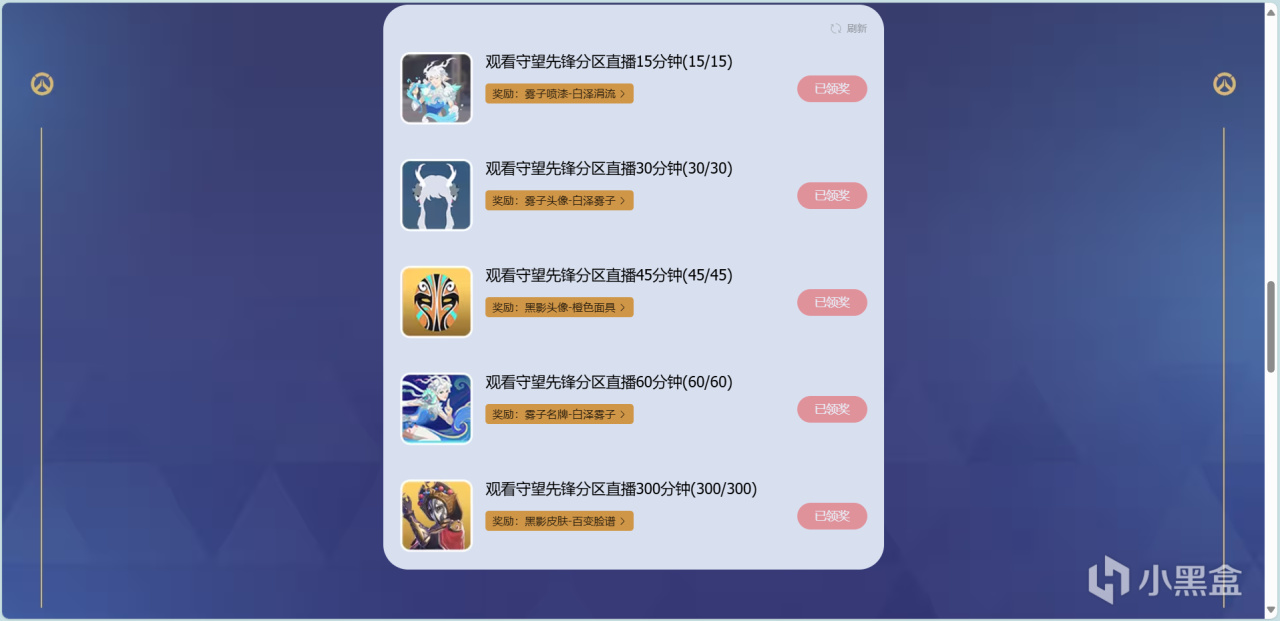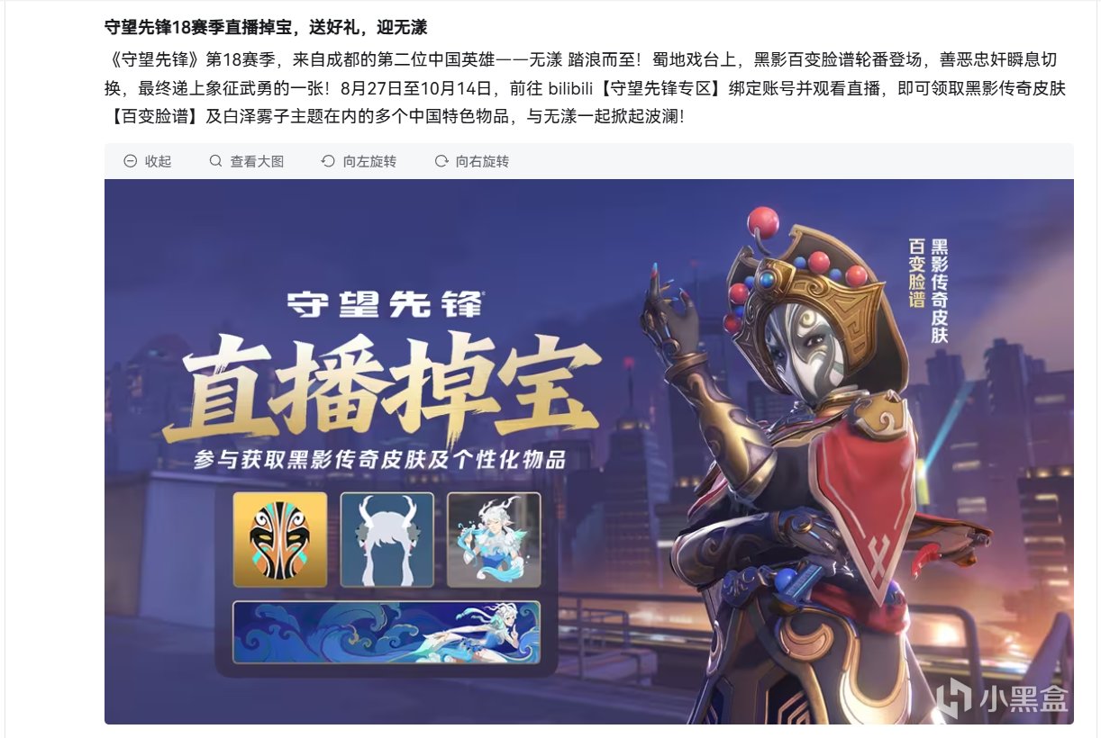黑影-百變臉譜,截止時間10月14號。累計觀看守望先鋒分區直播300分鐘獲得全部獎勵。黑影臉譜皮膚、頭像,霧子白澤頭像、噴漆、名牌。可以掛阿B多開。