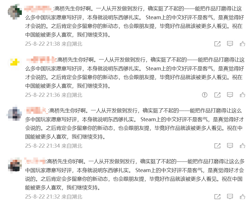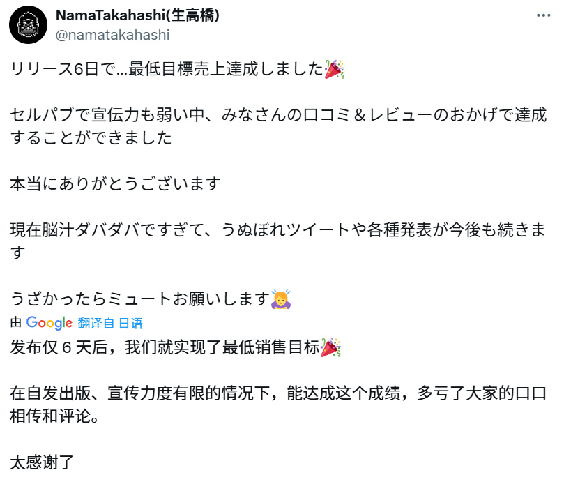 《Öoo》的作者生高桥,在游戏发售后不久,便察觉到了中国市场的潜力。8月22日,完全不懂中文的他专门注册了微博账号,在机翻的帮助下,他写下了自己来到中文社区的理由: