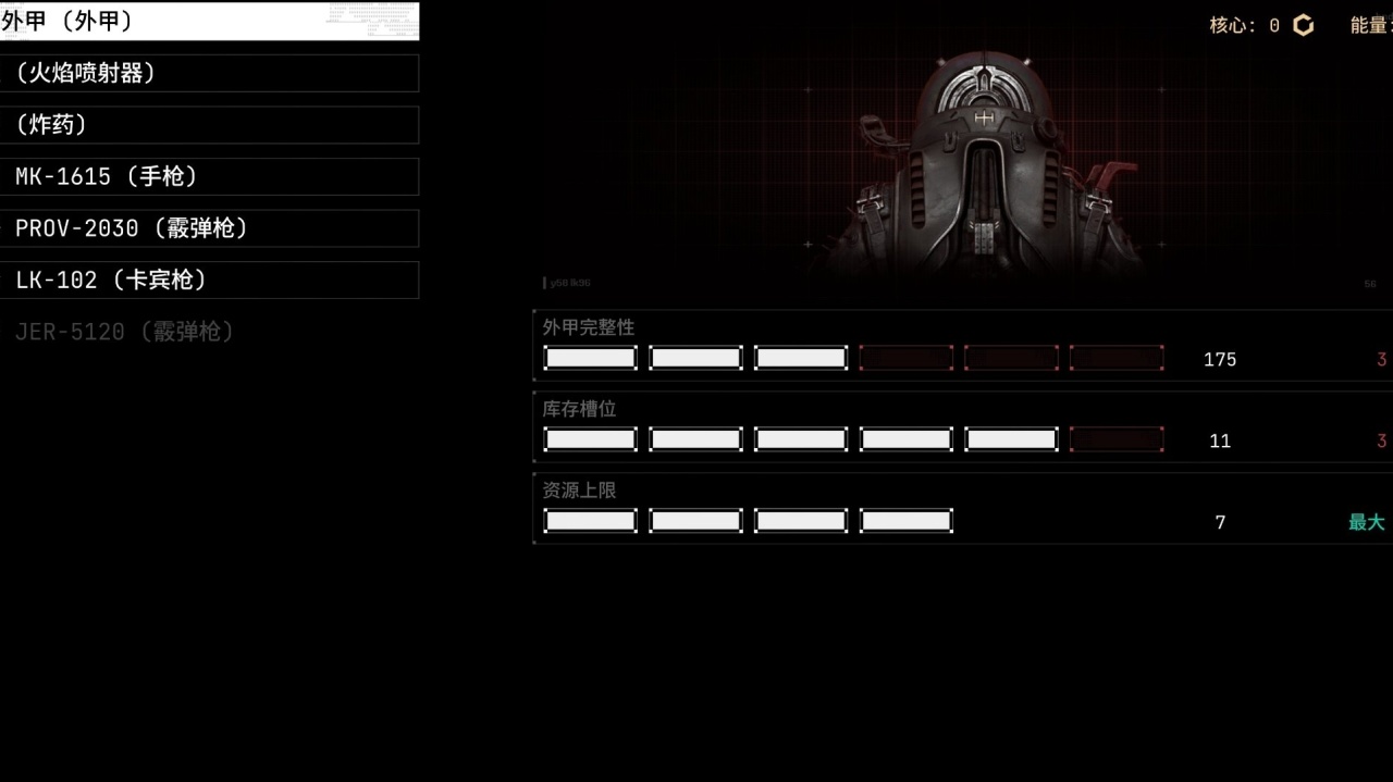 护甲,燃烧弹,爆炸弹升级需要名叫核心的道具进行升级,类似于死亡空间中的节点。
