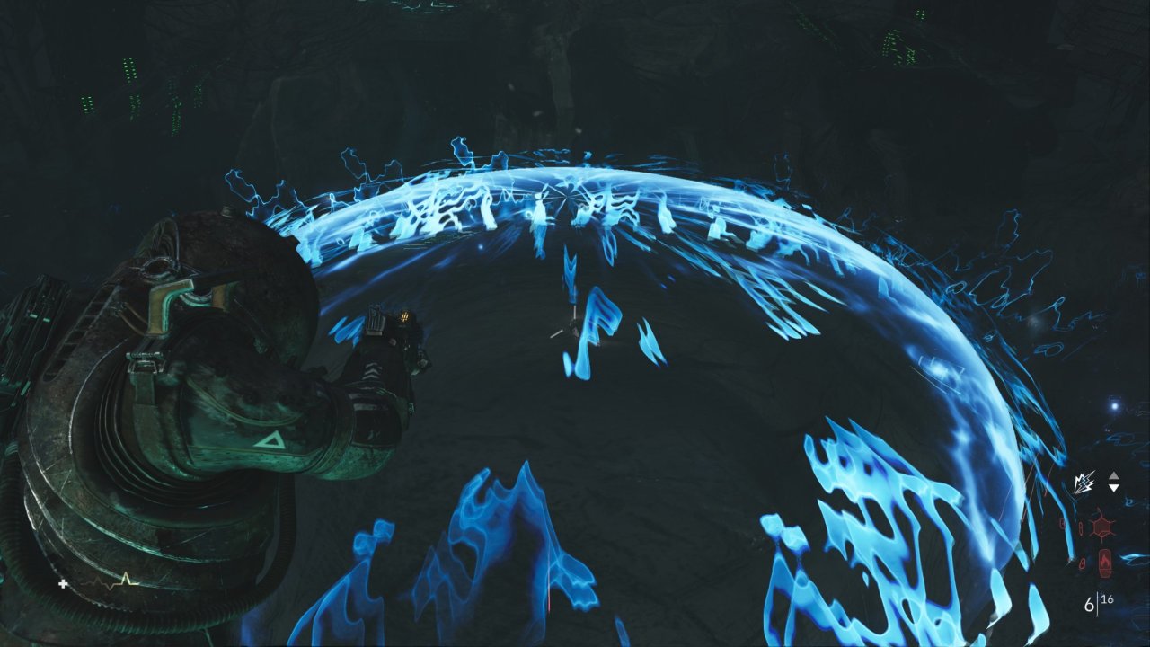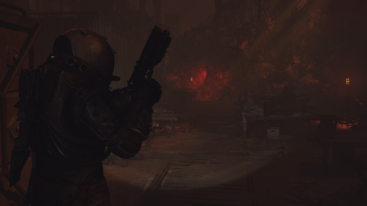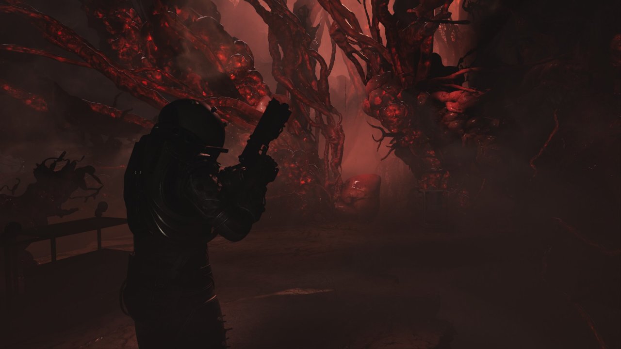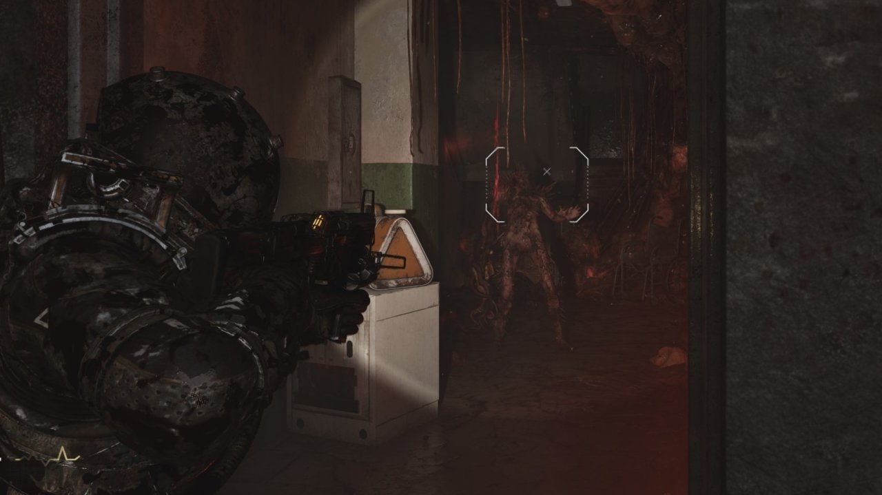 与死亡空间重制版一样,游戏的近战有砸拳以及腿部践踏,不同于死亡空间的是,游戏里的怪物韧性非常的强,似乎并不会因为近战攻击而遭受硬直,在实际游玩过程中,我基本上没有用过近战中断敌人的攻击。游戏没有死亡空间的断肢系统,高效的击杀敌人就是打头以及特定的弱点。