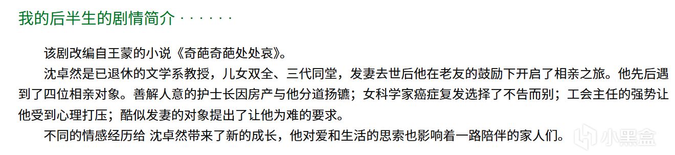 说来有趣,今年上半年,国内有部电视剧叫《我的后半生》,讲述了由张国立老师饰演的退休老教授,在老来丧偶的情况下,与四位身份迥异的大姨相亲的故事。因为剧情里掺杂了癌症、抢婚、替身文学、三角恋等极度狗血的情节,该剧被年轻观众狠狠吐槽,说是把黄昏恋拍成了男频爽文,豆瓣评分只有5.4。
