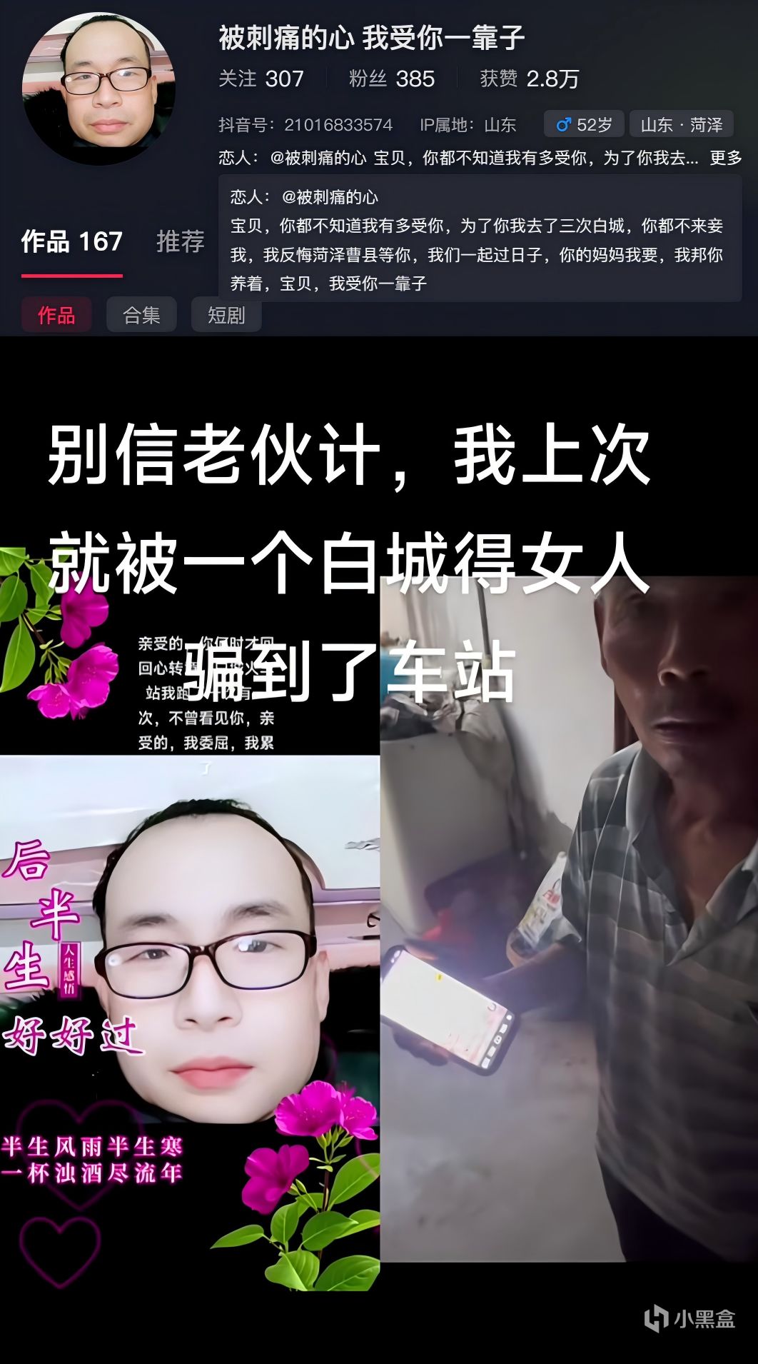 其中最出名的纯爱大爷,就是这位“但愿吧,”。你别看大爷在自己拍的视频里看上去一脸严肃,不苟言笑,但大爷是真的专程买了票到白城来找大姨的,结果就是大姨没亲到、丈母娘没见着,自己在白城火车站边上的优润宾馆待了三天,最后实在没有办法,只能打道回府。可即便如此,大爷现在的主页上,依旧挂着和白城大姨的合拍视频,可谓真爱至死不渝——被骗了又怎样,她一定是真心爱我的。
