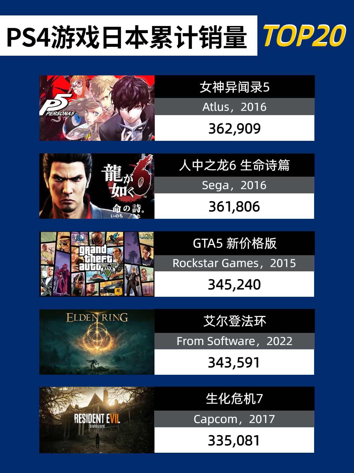 第一是《怪物猎人 世界》。TOP5中SE占4部,《最终幻想15》和《最终幻想7重制版》还不错,销量都在100万上下。上榜的还有多款COD,谁说日本人不玩射击游戏?最后不得不感叹一下,虽然PS5发售快5年,但PS4生命周期还没结束。