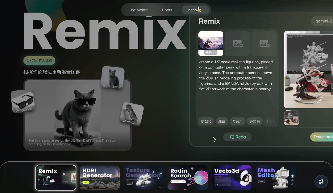 Hyper 3D 专注于 3D 模型与图像的混合生成。通过 Remix 功能,你可以上传参考图,然后用 Nano Banana 进行二次创作,非常适合做三维手办设计。