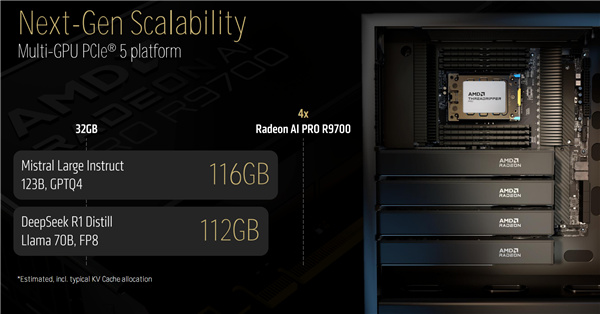 Radeon AI PRO R9700還可以支持四卡並行,搭配新發布的線程撕裂者PRO 9000WX系列,可以組成強大的PCIe 5.0 AI平臺,總計128GB顯存,輕鬆滿足70B、123B大模型的需求。