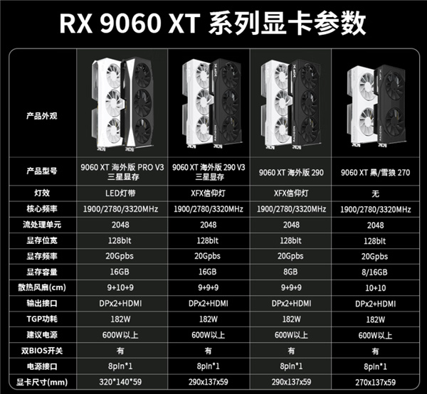 新卡包括RX 9060 XT海外版Pro V3(黑/白)、RX 9060 XT海外版290 V3(黑/白),價格分別爲3099元、2899元,均以V3結尾,並在規格表中明確標註三星顯存。