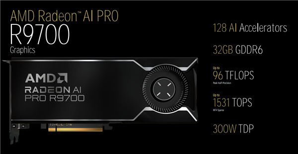 峯值性能FP16半精度浮點下位96 TOPS,INT4精度下則是1531 TOPS,是上代Radeon PRO W7800的最多兩倍。