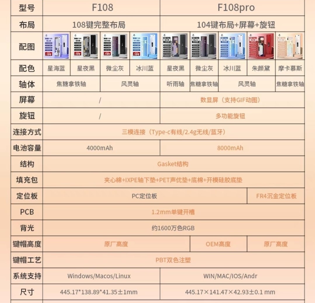 还是有厂家在发力全配列,全配列+带屏+旋钮的Gasket键盘,怎么也得把预算拉得更高,F108Pro直接压到了299元,这波操作属实让人惊喜。