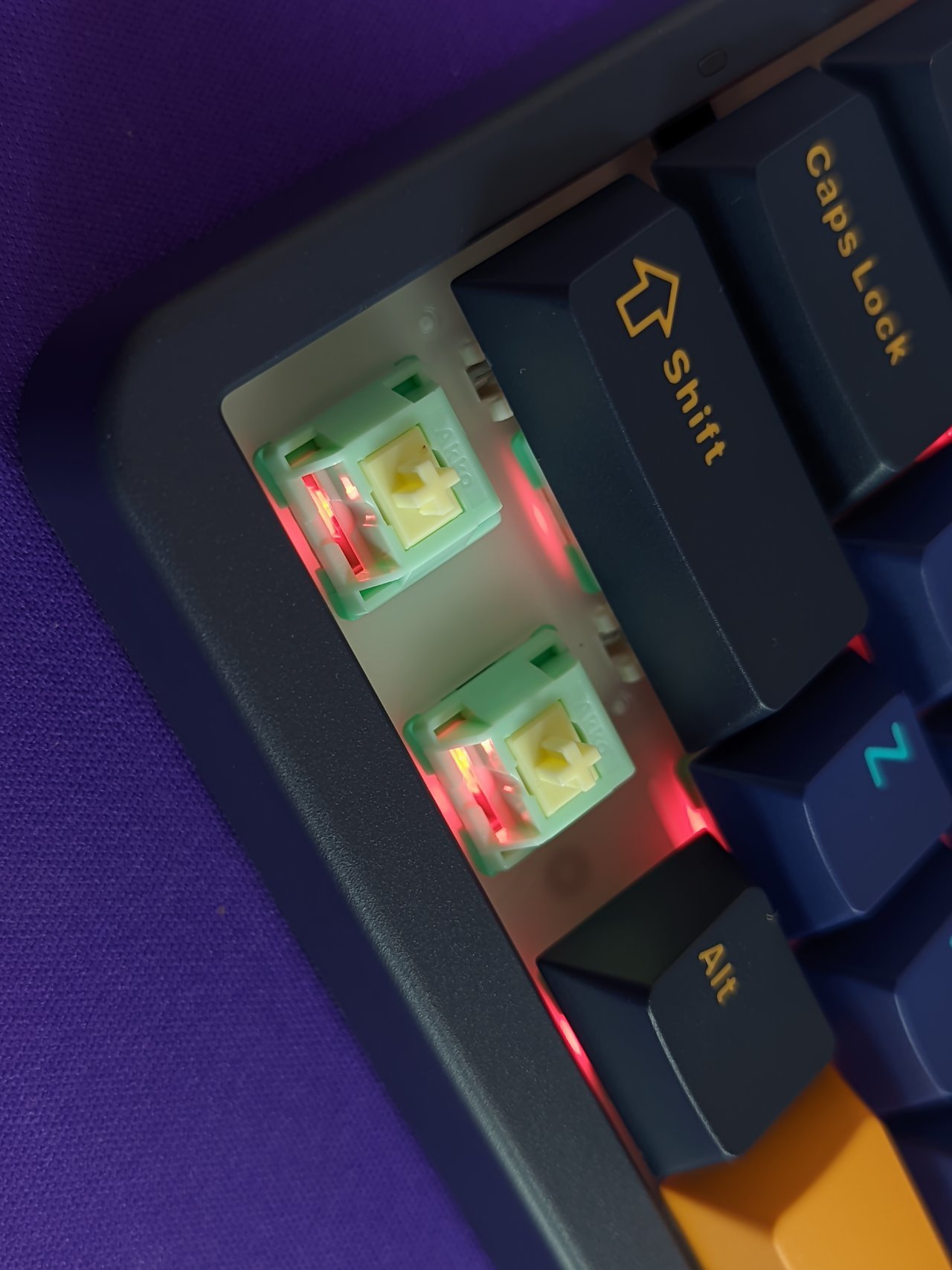 这款的配置就是98配列,轴体是凯华定制快银轴(35±10gf触发,还挺适合玩游戏的)稍微重点介绍一下轴体,快银轴是这种短行程、轻压力的轴,还挺像樱桃的银轴的,特点就是响应快,段落感不明显,但按下与回弹过程比较流畅,回弹也有力。然后按压声音也比较小,我感觉也比较适合宿舍使用的!(是谁宿舍青轴战神?)