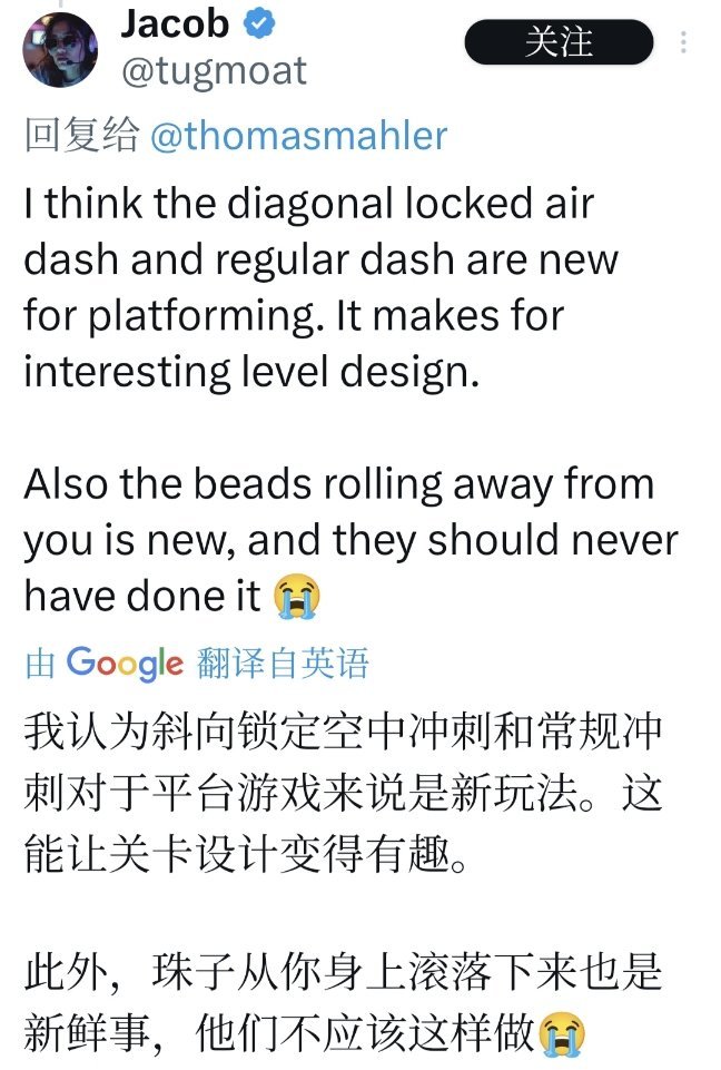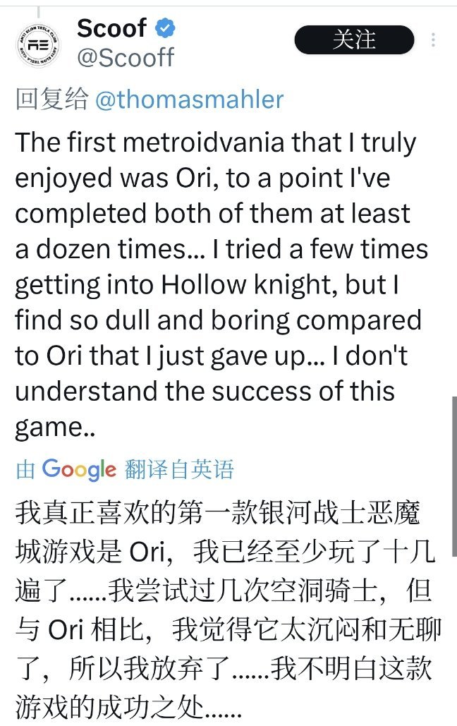 马勒表示,相较于初代《空洞骑士》,《丝之歌》的节奏感更符合他的个人喜好。他在游玩过程中感到非常享受,沉浸于游戏的氛围和设计中。作为一位开发过《奥日与黑暗森林》、《奥日与萤火意志》以及《恶意不息》等作品的资深开发者,马勒对游戏设计的敏锐洞察力使得他的评价颇具分量。他提到,《丝之歌》的节奏感可能在某些方面进行了优化,比如探索、战斗或关卡设计的流畅度,这让他对游戏的整体体验赞不绝口。