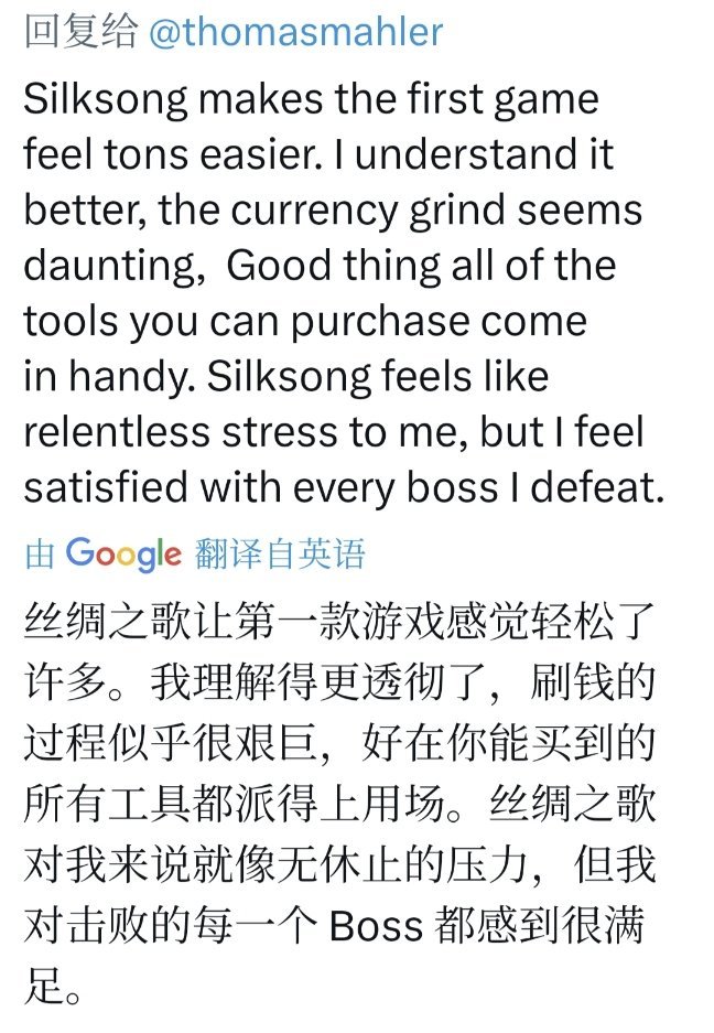此外,Mahler还在发文中询问玩家是否已在《丝之歌》中发现能推动该类型游戏进化的全新元素。目前,他本人已投入4 - 5小时游玩,仍好奇心不减,继续探索这款作品。