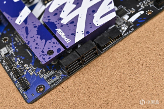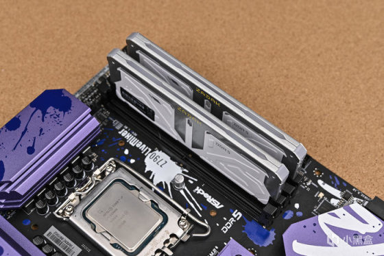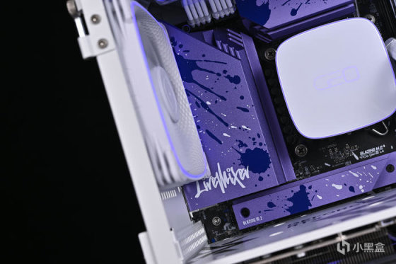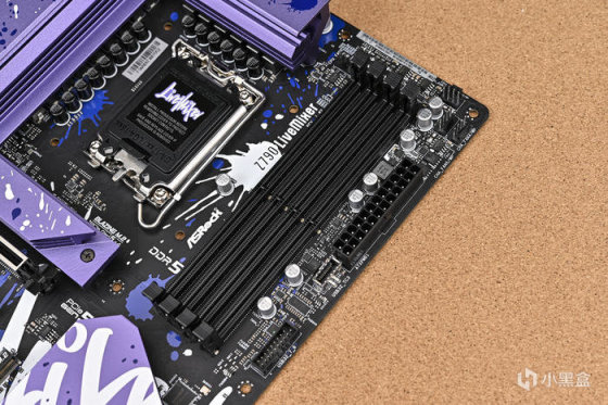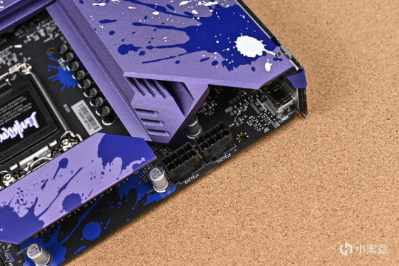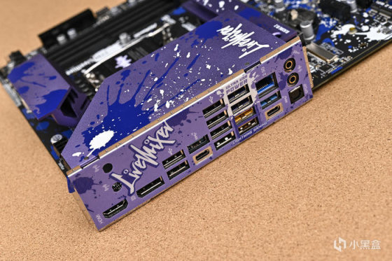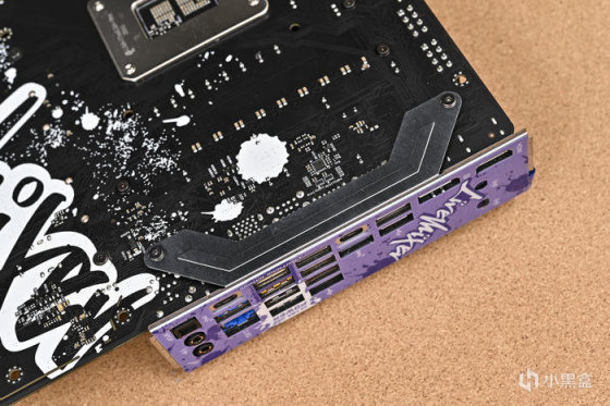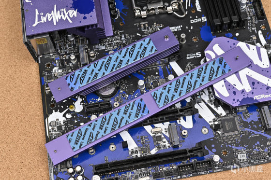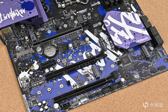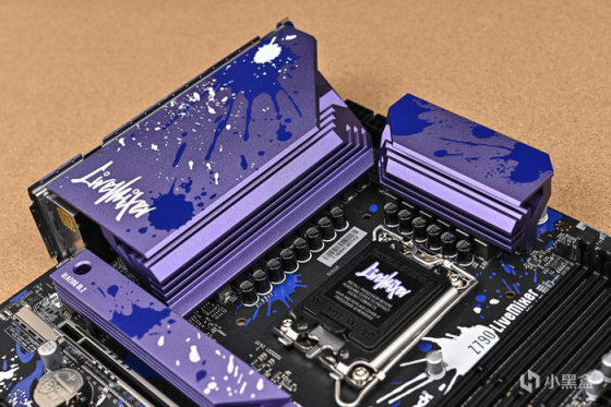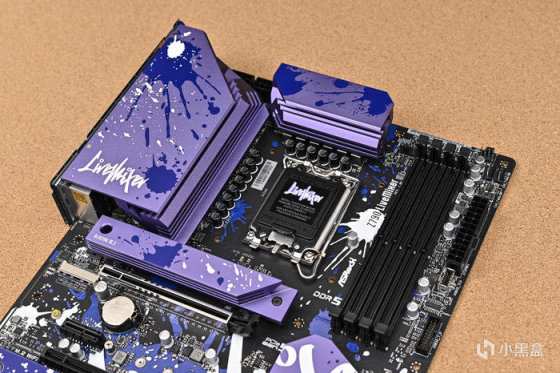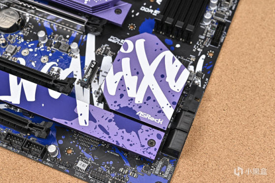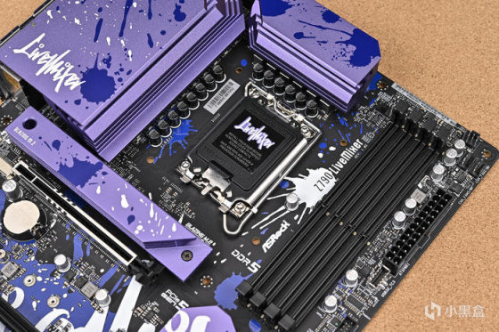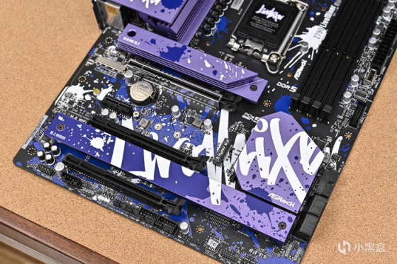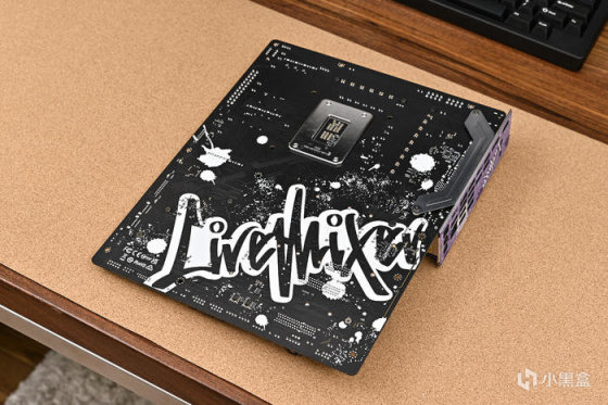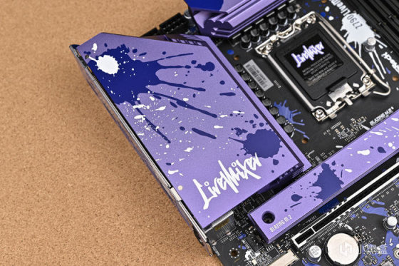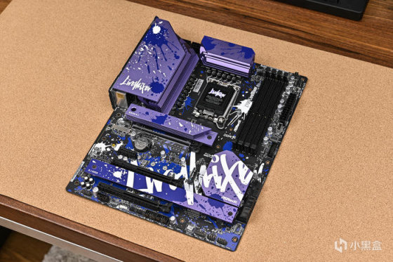 取出主板。可以看到華擎 Z790 LiveMixer 這款 ATX 主板配色非常個性,黑色的PCB,紫色的散熱裝甲,在此基礎上用藍色做了噴墨噴塗,使用白色進行藝術字體塗鴉。