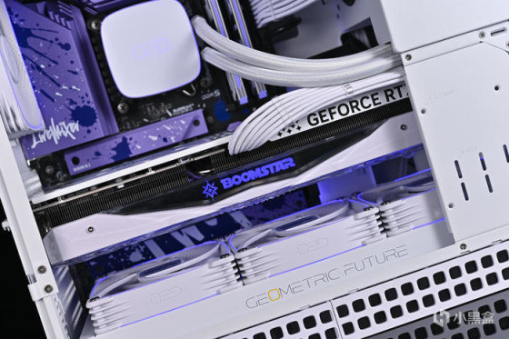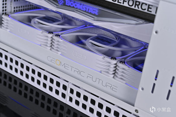 顯卡右側則是 BOOMSTAR Logo,下方做了幾何鏤空開窗,貫穿通風,減少尾部中央防止下垂,同時兼顧更加散熱風道。