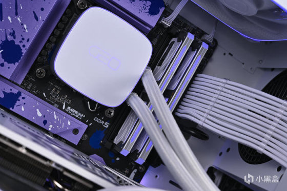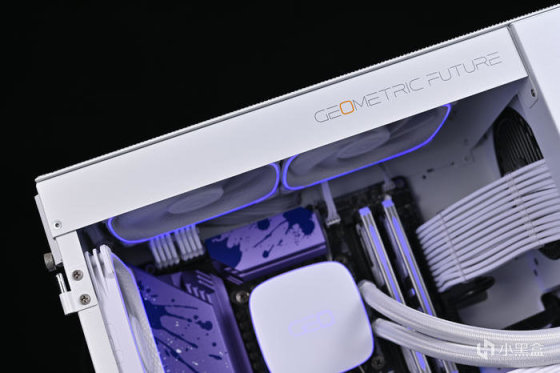 水冷頭正面白色設計,中間GEO爲幾何未來名稱簡寫,附帶ARGB燈光,支持主板同步。