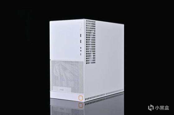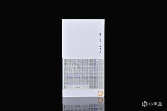 機箱正面。前面板上下分層設計,上部爲整塊鋼板封閉式設計,下方通風 Mesh 網孔設計。