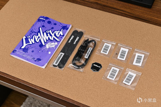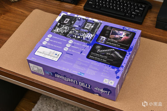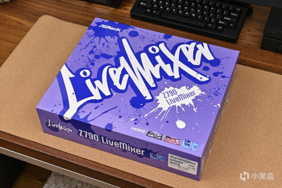 主板來自華擎 ASRock Z790 LiveMixer。這款主板是華擎專爲內容創作者設計的,性能穩定可靠並提供完善的擴展連接組合,而且爲流媒體和直播的輔助設備提供良好支持。外包裝紫色打底並做了藍色噴墨塗鴉,中央斜向 LiveMixer 藝術字樣。