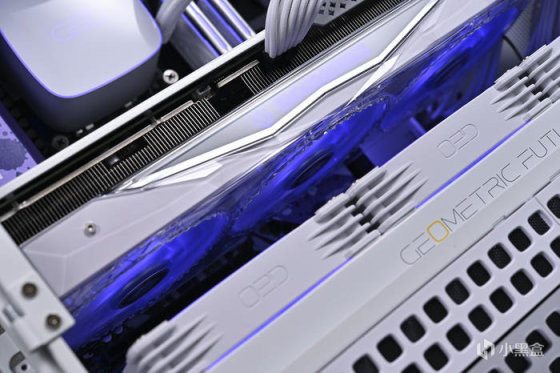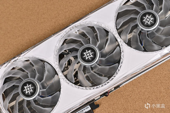 正面標配 3 顆 102mm 厚度 20mm ARGB 靜霜風扇,採用三折式 11 片扇葉設計,風流風壓更強,加快顯卡熱量傳遞,同時支持智能風扇停轉,低負載下降低噪音和減少功耗。