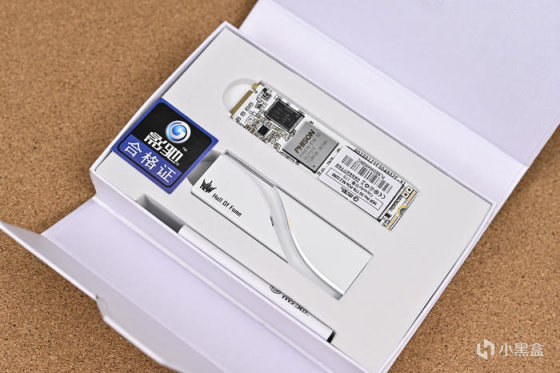 打開磁吸蓋板,內部白色發泡海綿包裹 SSD、散熱器,保護運輸安全,還有一本使用指南及合格證。