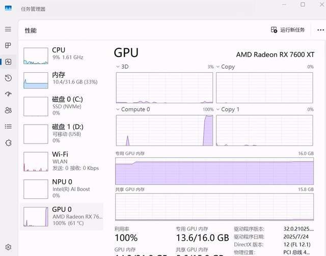 系统内存的占用大约为10GB。对于我们配置的32GB内存来说,这个占用率留下了充足的余量,可以轻松应对多任务场景。如果用户有处理超长上下文(例如分析长篇文档)的需求,将内存升级到64GB会更加稳妥。