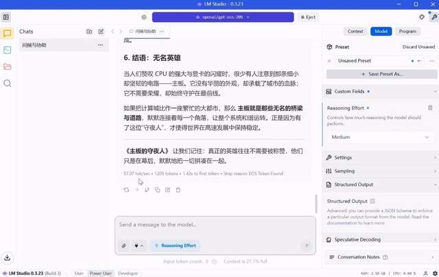 当切换到对硬件调用和优化更好的LM Studio前端时,速度提升非常明显,达到了57 Tokens/秒。超过一倍的性能提升意味着在处理更复杂的任务,例如生成长篇文章或作为Agent应用后端时,能够获得更高的效率和更快的响应。