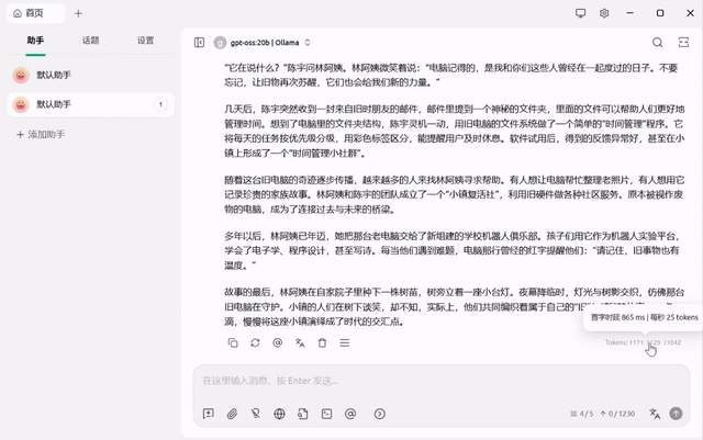 运行Ollama后,使用Cherry Studio来接入Ollama端口,让GPT-OSS-12B模型可以在Cherry Studio上使用。可以看到模型的生成速度可以达到25 Tokens/秒。这个速度对于日常的交互式对话和简单的文本生成任务来说已经足够,可以提供流畅无卡顿的体验。