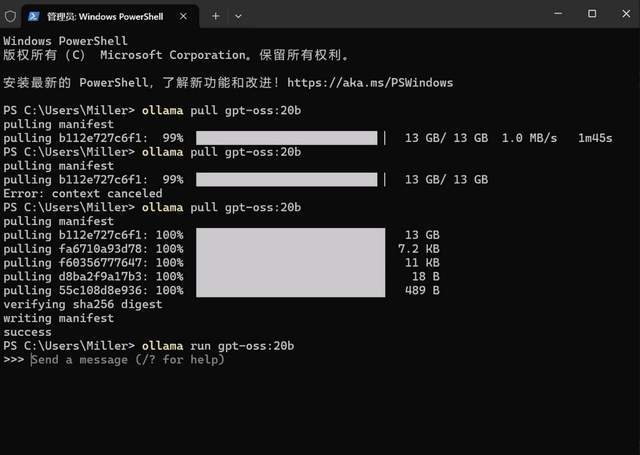 模型下载完毕,现在就可以启动它了!同样是在终端里,输入以下命令:ollama run gpt-oss:20b