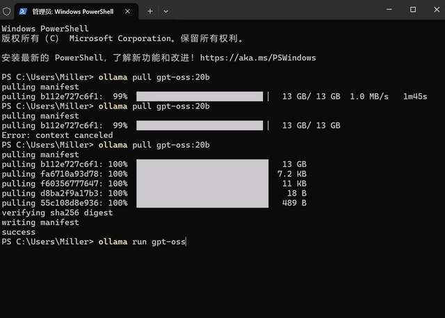 这行命令会告诉Ollama去官方模型库下载gpt-oss模型的20b版本。模型文件大约有14GB,下载速度取决于你的网络情况,请耐心等待。当看到“success”的提示时,就代表模型已经成功下载到你的电脑了。
