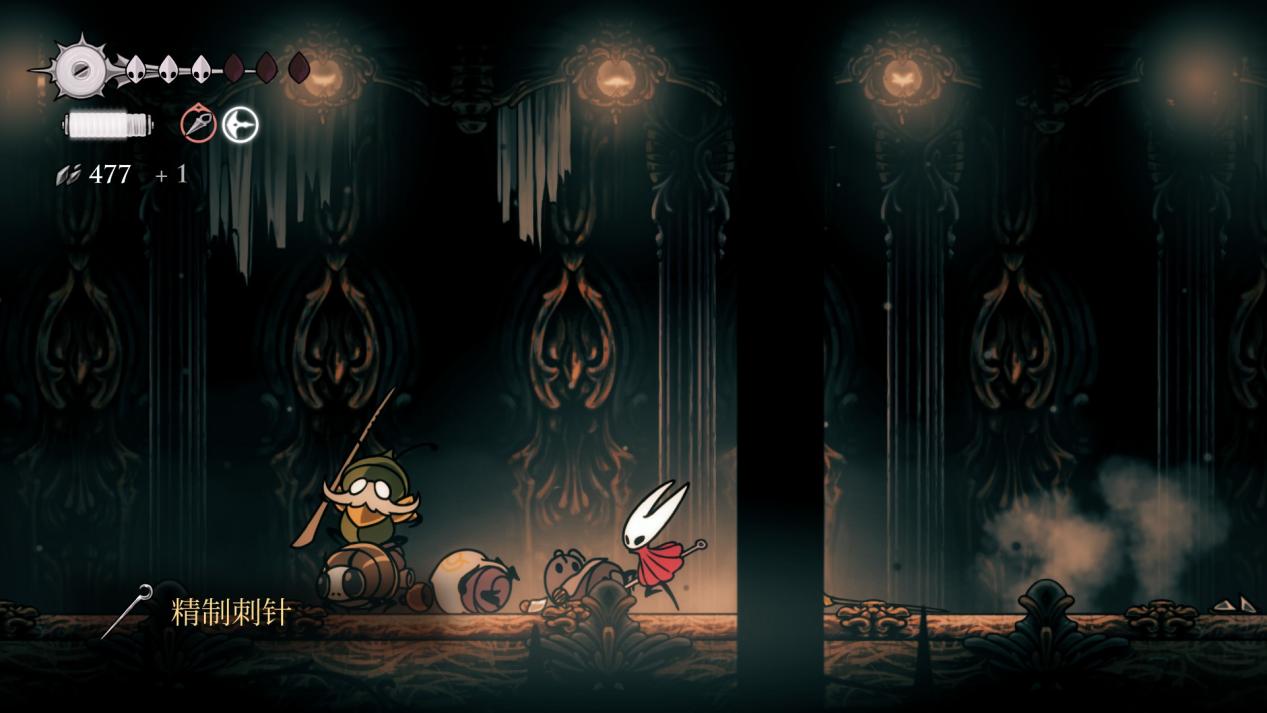 然后遭遇战这块,丝之歌相对于空洞骑士而言,最让人难以接受的除去奖励稀少,被小怪嗷嗷揍外,更多是因为被塞在主线上不得不打的憋屈,加上前文提到的频繁出现的两血怪,谁来打这都不吱声,甚至像前期地图的小怪封走位、逼墙角各种阴招全往玩家身上招呼了,打这些关卡前在我没去找轮椅道具前,甚至光用2级刀高庭11连战打了快一天,快给我打自闭了,
